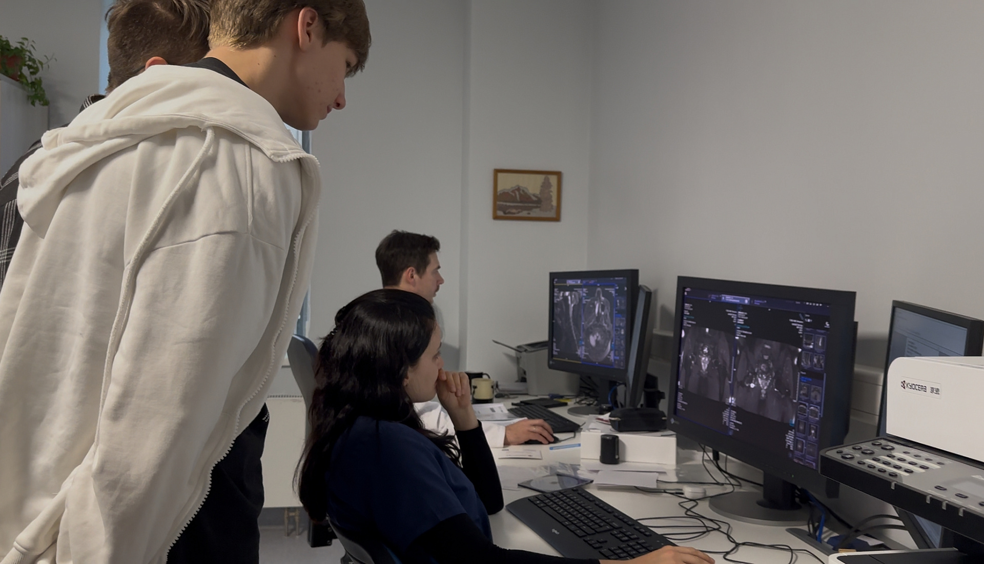 Первым пунктом экскурсии стало посещение отделения проблемно-ориентированной амбулаторной помощи. Здесь главный врач консультативно-диагностического центра университетской клиники Анна Олеговна Наймушина познакомила гостей с новейшими методами диагностики и лечения. Особое внимание привлекло использование технологий искусственного интеллекта для сбора анамнеза пациентов, что значительно повышает точность постановки диагноза и эффективность терапии. Кроме того, школьники смогли ознакомиться с одним из трёх уникальных компьютерных томографов, действующих в России. Этот аппарат выделяется своей бесшумностью и высокой скоростью обработки данных, обеспечивая комфорт пациентам и ускоряя процесс диагностики.
