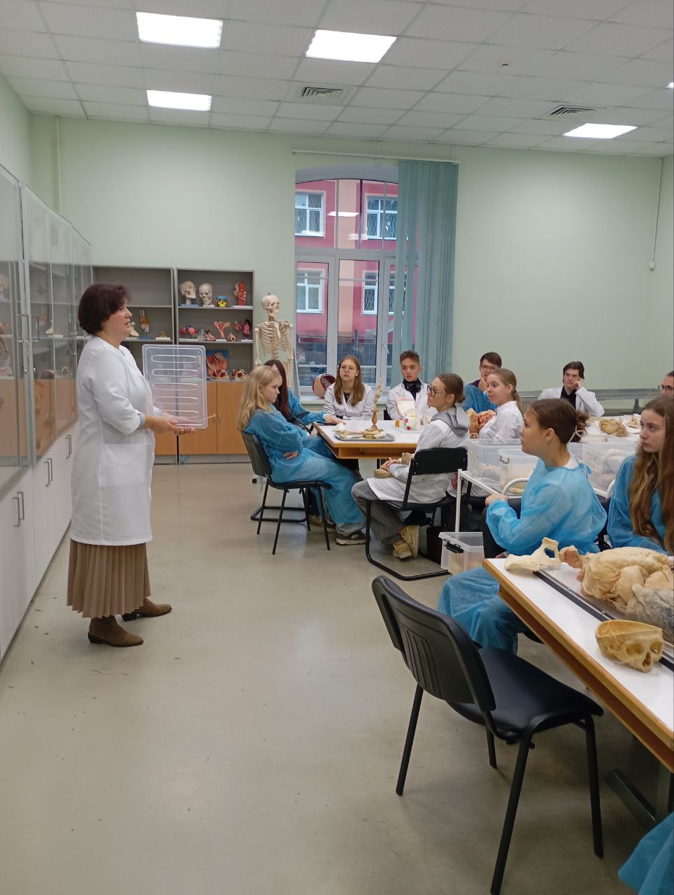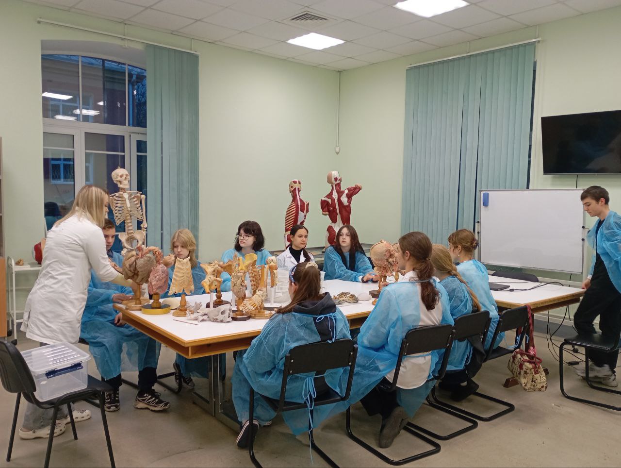 В дни школьных осенних каникул 27.10.2025 и 29.10.2025 Обучающиеся подготовительных курсов Факультета довузовского образования и молодежной науки Института медицинского образования Центра Алмазова в рамках профориентационных экскурсий посетили кафедру Анатомии человека Института медицинского образования ФГБУ «НМИЦ им. В.А.Алмазова» Минздрава России. Ребята познакомились с направлениями современных анатомических исследований и методиками хранения анатомических препаратов. Ассистент кафедры анатомии человека Зайцева Анна Валерьевна и доцент кафедры анатомии человека НМИЦ им. В.А. Алмазова. Матвеева Елена Павловна рассказали обучающимся о важн ости знани й по анатомии при осмотре и обследовании пациентов, проведении элементарных медицинских манипуляций, не говоря уже о хирургических операциях.