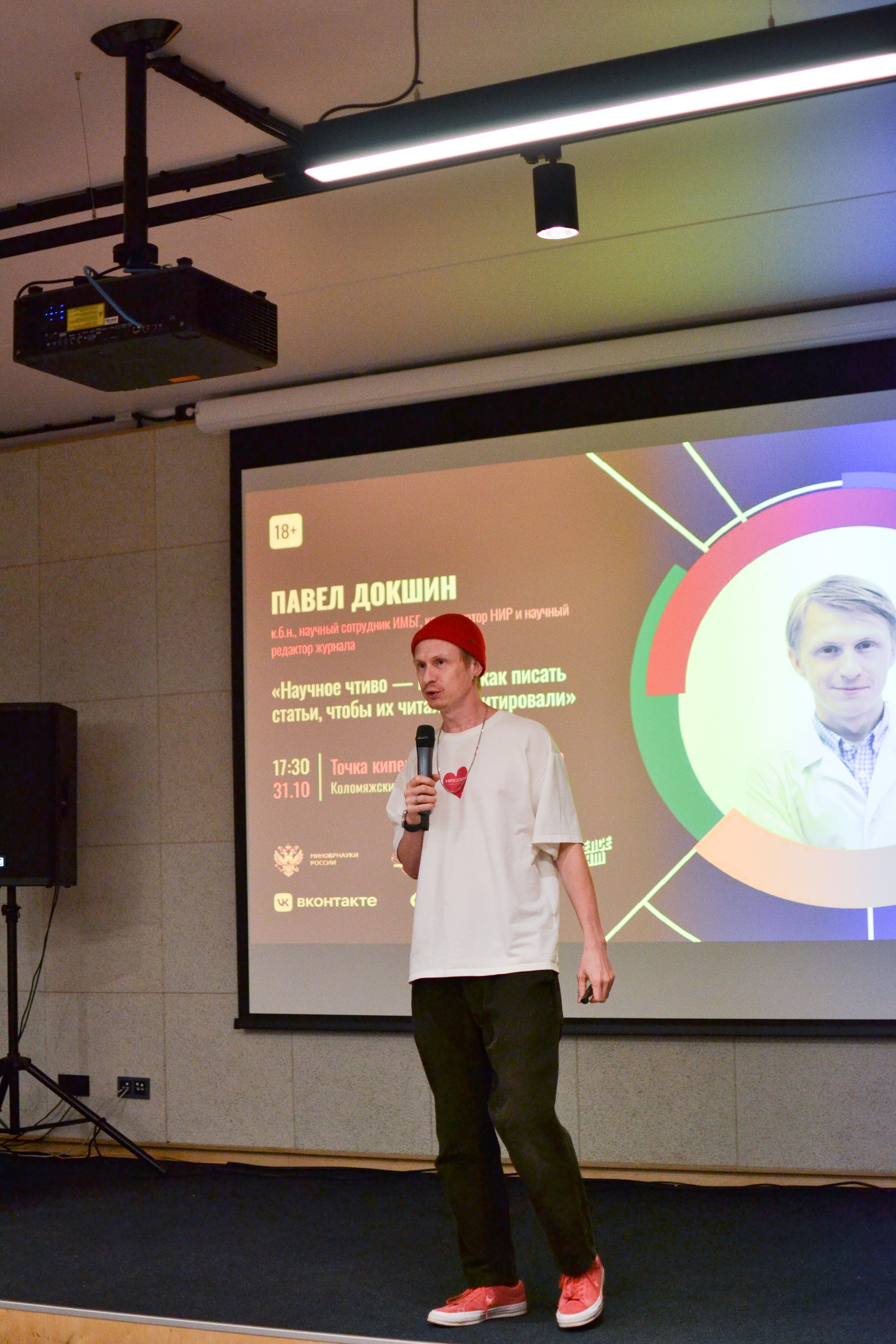 На разогреве выступил воплотивший детскую мечту стать рок-звездой Павел Докшин, к.б.н., научный сотрудник ИМБГ, координатор НИР и научный редактор журнала «Трансляционная медицина». В стиле рэпа он: