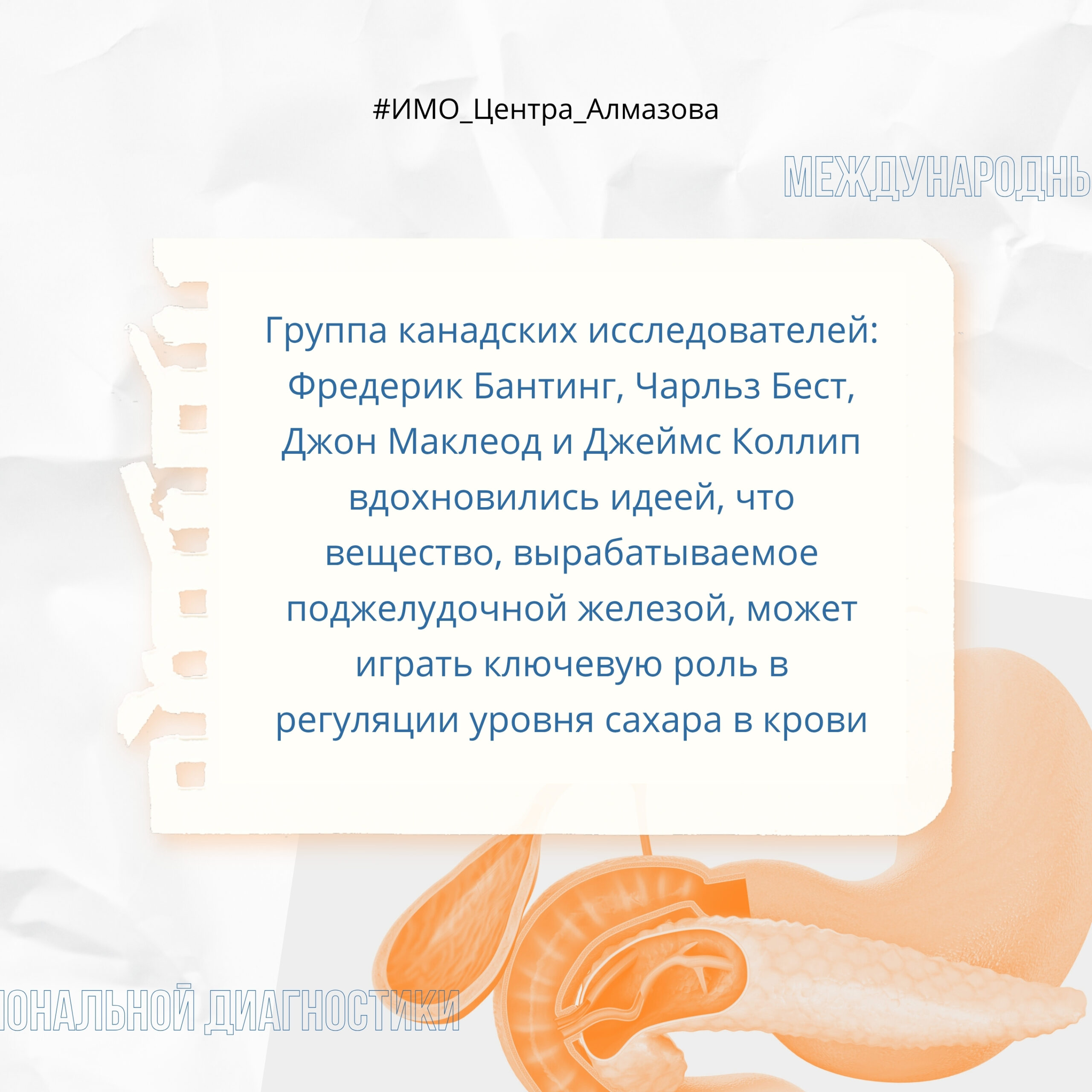 Группа канадских исследователей: Фредерик Бантинг, Чарльз Бест, Джон Маклеод и Джеймс Коллип вдохновились идеей, что вещество, вырабатываемое поджелудочной железой, может играть ключевую роль в регуляции уровня сахара в крови. Ряд исследований показал, что перевязка протока поджелудочной железы у собак приводит к дегенерации её экзокринной части, но сохранению внутренней железы. Бантинг предположил, что именно внутренняя часть (островки Лангерганса) производит необходимое вещество и задался целью выделить его. В результате многолетних экспериментов и обработки поджелудочных желез животных ученые смогли выделить активное вещество. Оно эффективно снижало уровень сахара в крови у собак с удаленной поджелудочной железой. Это вещество получило название инсулин (от латинского «insula» — островок). 22 января 1922 года был спасен первый пациент — четырнадцатилетний Леонард Томпсон. Родители дали согласие на экспериментальное лечение, потому что мальчик уже впал в кому и ничто не могло ему помочь. Введение очищенного от чужеродных белков инсулина сохранило ему жизнь и положило начало новой эпохи в эндокринологии.