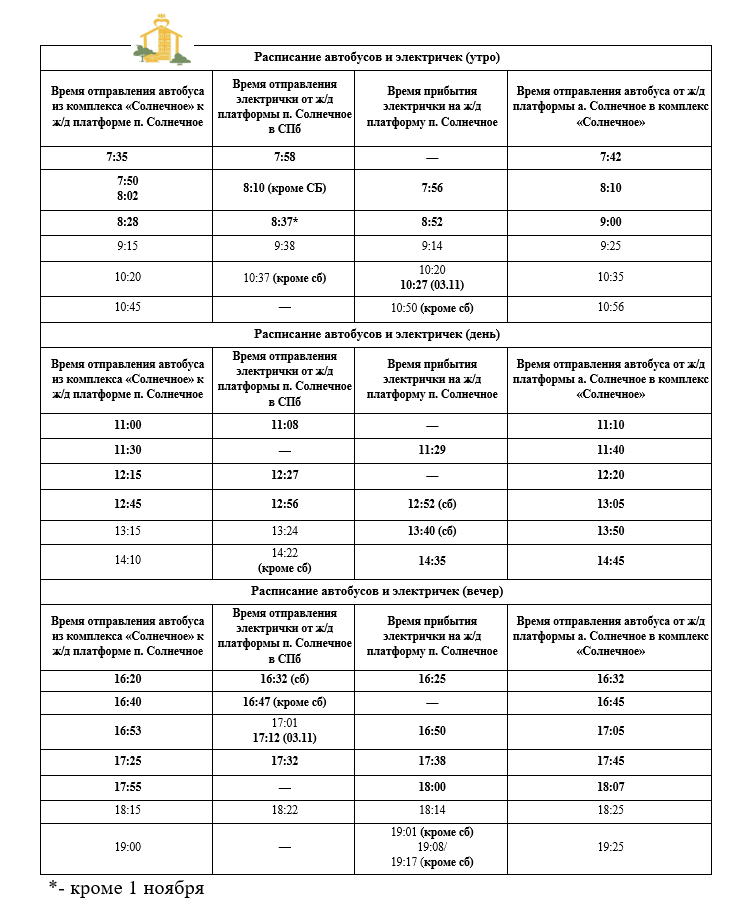 Просьба ознакомиться с расписанием автобусов и электричек по маршруту НОМБЦ «Солнечный» – ж/д станция “Солнечное”. Обращаем внимание, новое расписание действует с 31.10.2025 г.